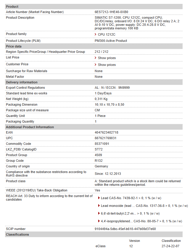 | SIMATIC S7-1200, CPU 1212C, compact CPU, DC/DC/relay, onboard I/O: 8 DI 24 V DC; 6 DO relay 2 A; 2 AI 0-10 V DC, power supply: DC 20.4-28.8 V DC, program/data memory 100 KB |