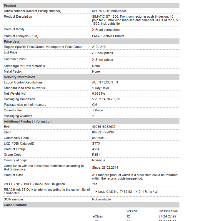 | SIMATIC S7-1500, Front connector in push-in design, 40-pole for 25 mm wide modules and compact CPUs of the S7-1500, incl. cable tie |