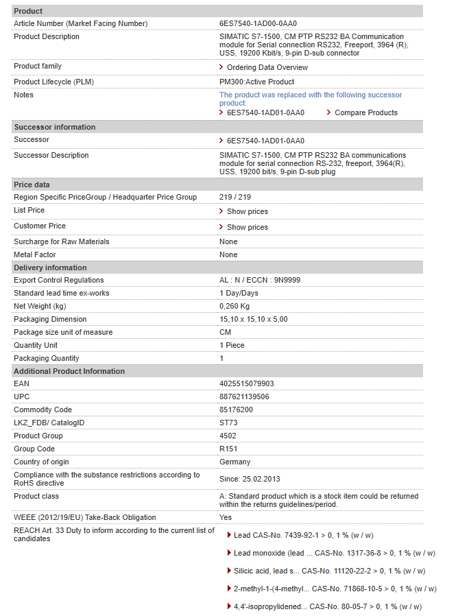 | SIMATIC S7-1500, CM PTP RS232 BA Communication module for Serial connection RS232, Freeport, 3964 (R), USS, 19200 Kbit/s, 9-pin D-sub connector |