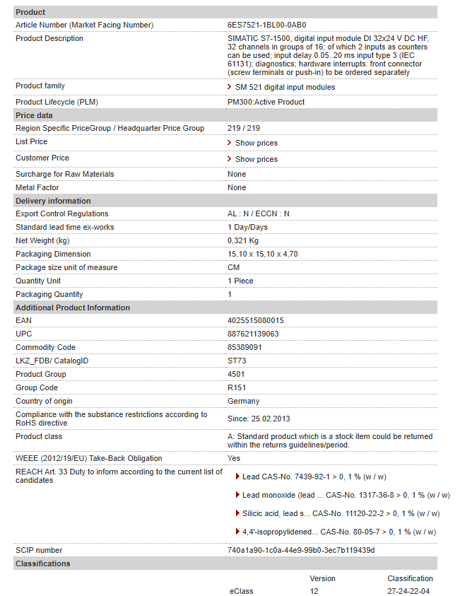 SIMATIC S7-1500, digital input module DI 32×24 V DC HF, 32 channels in groups of 16; of which 2 inputs as counters can be used; input delay 0.05..20 ms input type 3 (IEC 61131); diagnostics; hardware interrupts: front connector (screw terminals or push-in) to be ordered separately