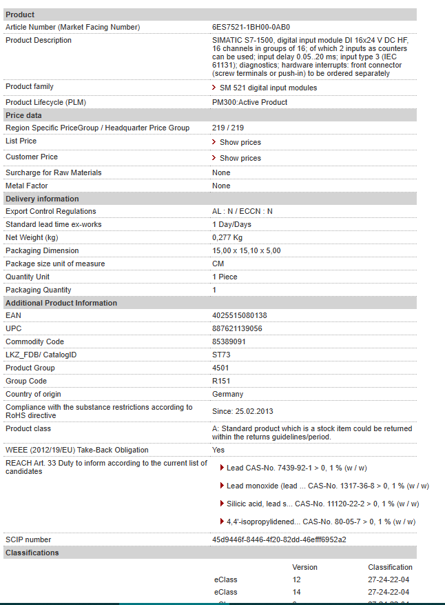 | SIMATIC S7-1500, digital input module DI 16×24 V DC HF, 16 channels in groups of 16; of which 2 inputs as counters can be used; input delay 0.05..20 ms; input type 3 (IEC 61131); diagnostics; hardware interrupts: front connector (screw terminals or push-in) to be ordered separately |