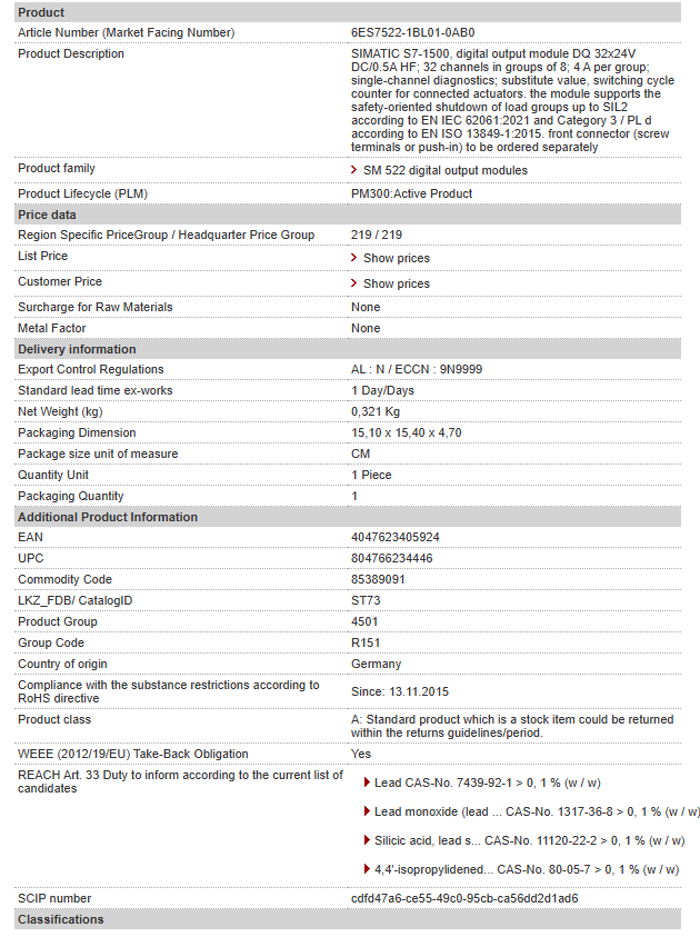 | SIMATIC S7-1500, digital output module DQ 32x24V DC/0.5A HF; 32 channels in groups of 8; 4 A per group; single-channel diagnostics; substitute value, switching cycle counter for connected actuators. the module supports the safety-oriented shutdown of load groups up to SIL2 according to EN IEC 62061:2021 and Category 3 / PL d according to EN ISO 13849-1:2015. front connector (screw terminals or push-in) to be ordered separately |