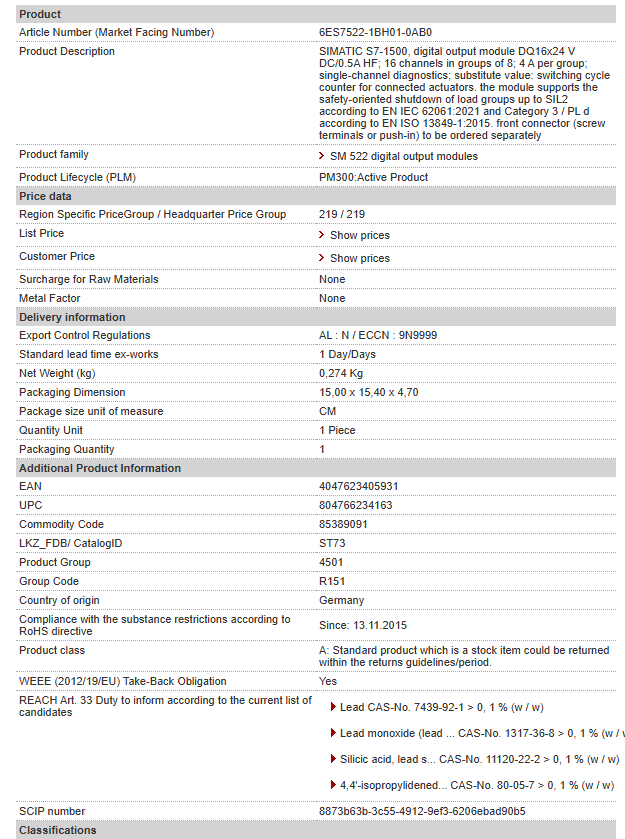 | SIMATIC S7-1500, digital output module DQ16x24 V DC/0.5A HF; 16 channels in groups of 8; 4 A per group; single-channel diagnostics; substitute value: switching cycle counter for connected actuators. the module supports the safety-oriented shutdown of load groups up to SIL2 according to EN IEC 62061:2021 and Category 3 / PL d according to EN ISO 13849-1:2015. front connector (screw terminals or push-in) to be ordered separately |