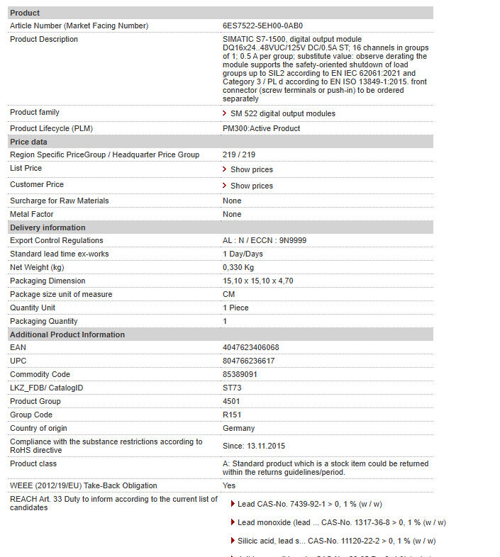 | SIMATIC S7-1500, digital output module DQ16x24..48VUC/125V DC/0.5A ST; 16 channels in groups of 1; 0.5 A per group; substitute value: observe derating the module supports the safety-oriented shutdown of load groups up to SIL2 according to EN IEC 62061:2021 and Category 3 / PL d according to EN ISO 13849-1:2015. front connector (screw terminals or push-in) to be ordered separately |