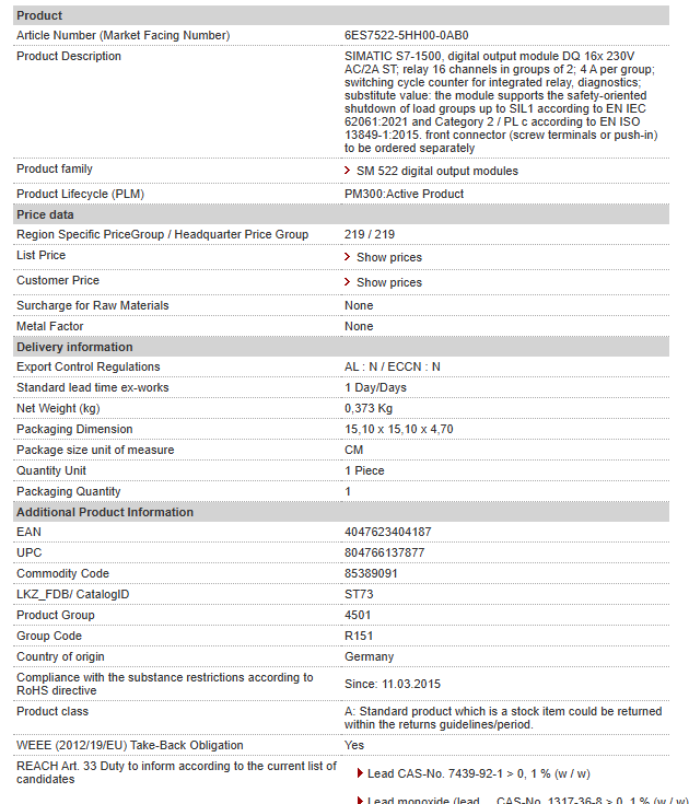 | SIMATIC S7-1500, digital output module DQ 16x 230V AC/2A ST; relay 16 channels in groups of 2; 4 A per group; switching cycle counter for integrated relay, diagnostics; substitute value: the module supports the safety-oriented shutdown of load groups up to SIL1 according to EN IEC 62061:2021 and Category 2 / PL c according to EN ISO 13849-1:2015. front connector (screw terminals or push-in) to be ordered separately |