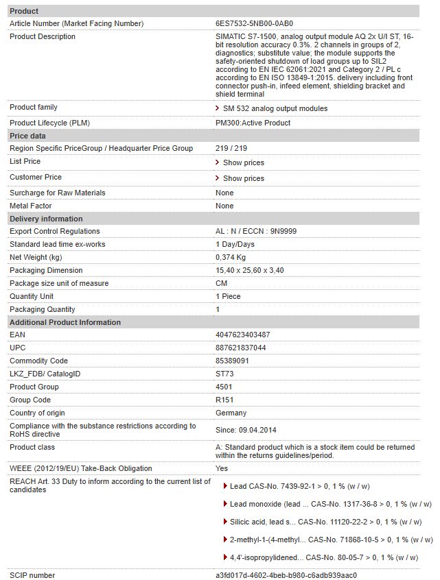 | SIMATIC S7-1500, analog output module AQ 2x U/I ST, 16-bit resolution accuracy 0.3%. 2 channels in groups of 2, diagnostics; substitute value; the module supports the safety-oriented shutdown of load groups up to SIL2 according to EN IEC 62061:2021 and Category 2 / PL c according to EN ISO 13849-1:2015. delivery including front connector push-in, infeed element, shielding bracket and shield terminal |