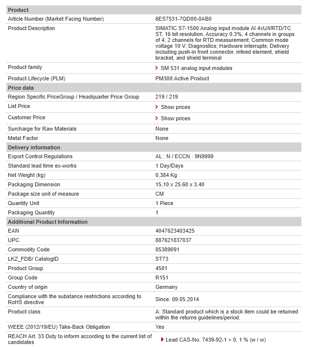 | SIMATIC S7-1500 Analog input module AI 4xU/I/RTD/TC ST, 16 bit resolution, Accuracy 0.3%, 4 channels in groups of 4; 2 channels for RTD measurement; Common mode voltage 10 V; Diagnostics; Hardware interrupts; Delivery including push-in front connector, infeed element, shield bracket, and shield terminal |