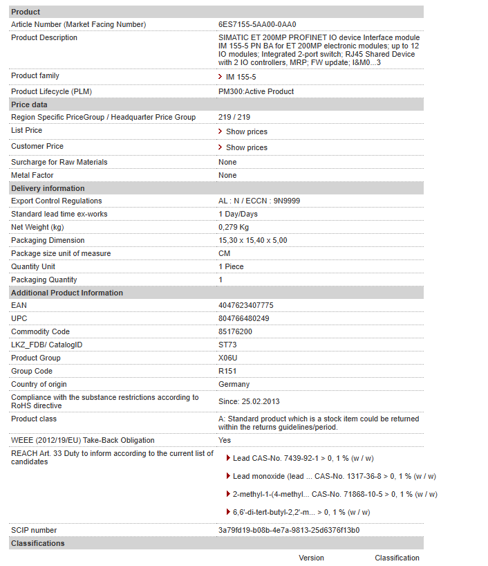 SIMATIC ET 200MP PROFINET IO device Interface module IM 155-5 PN BA for ET 200MP electronic modules; up to 12 IO modules; Integrated 2-port switch; RJ45 Shared Device with 2 IO controllers, MRP; FW update; I&M0…3