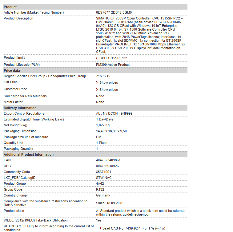 | SIMATIC ET 200SP Open Controller, CPU 1515SP PC2 + HMI 2048PT, 8 GB RAM (basic device 6ES7677-2DB40-0AA0), 128 GB CFast with Windows 10 IoT Enterprise LTSC 2019 64-bit, S7-1500 Software Controller CPU 1505SP V2x and WinCC Runtime Advanced V17 preinstalled, with 2048 PowerTags license; interfaces: 1x slot CFast, 1x slot SD/MMC, 1x connection for ET 200SP BusAdapter PROFINET, 1x 10/100/1000 Mbps Ethernet, 2x USB 3.0, 2x USB 2.0, 1x DisplayPort; documentation on CFast, |
