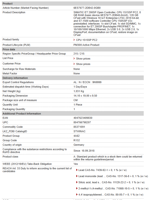| SIMATIC ET 200SP Open Controller, CPU 1515SP PC2, 8 GB RAM (basic device 6ES7677-2DB40-0AA0), 128 GB CFast with Windows 10 IoT Enterprise LTSC 2019 64-bit, and S7-1500 software Controller CPU 1505SP V2x preinstalled; interfaces: 1x slot CFast, 1x slot SD/MMC, 1x connection for ET 200SP BusAdapter PROFINET, 1x 10/100/1000 Mbps Ethernet, 2x USB 3.0; 2x USB 2.0, 1x DisplayPort; documentation on CFast, restore image on CFast |