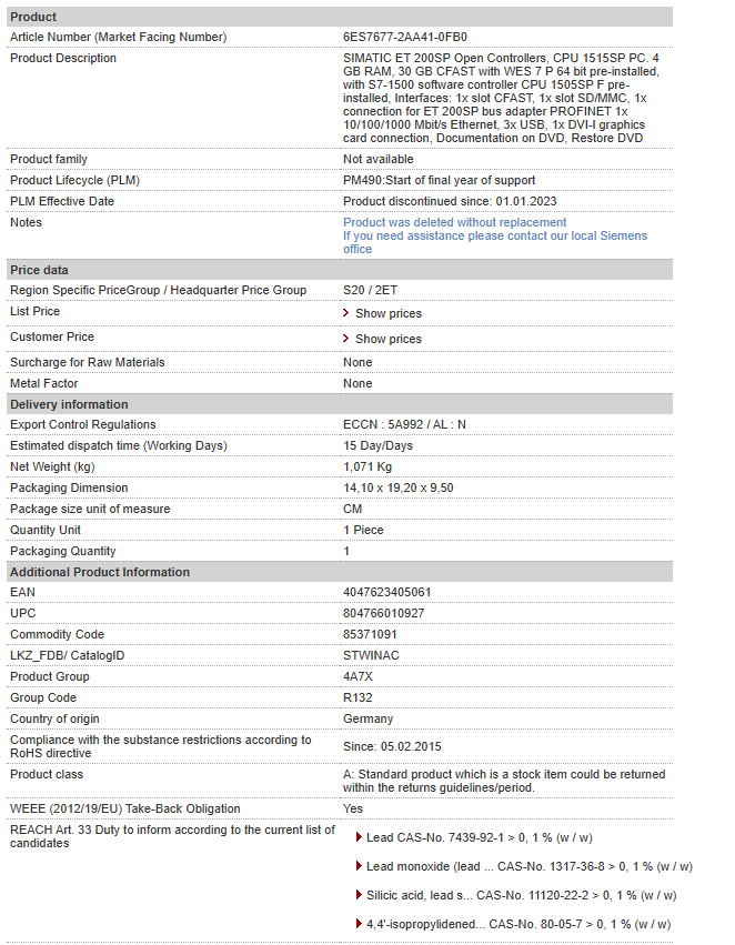 | SIMATIC ET 200SP Open Controllers, CPU 1515SP PC. 4 GB RAM, 30 GB CFAST with WES 7 P 64 bit pre-installed, with S7-1500 software controller CPU 1505SP F pre-installed, Interfaces: 1x slot CFAST, 1x slot SD/MMC, 1x connection for ET 200SP bus adapter PROFINET 1x 10/100/1000 Mbit/s Ethernet, 3x USB, 1x DVI-I graphics card connection, Documentation on DVD, Restore DVD |