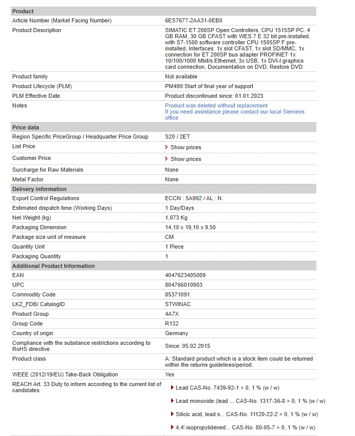| SIMATIC ET 200SP Open Controllers, CPU 1515SP PC. 4 GB RAM, 30 GB CFAST with WES 7 E 32 bit pre-installed, with S7-1500 software controller CPU 1505SP F pre-installed, Interfaces: 1x slot CFAST, 1x slot SD/MMC, 1x connection for ET 200SP bus adapter PROFINET 1x 10/100/1000 Mbit/s Ethernet, 3x USB, 1x DVI-I graphics card connection, Documentation on DVD, Restore DVD |