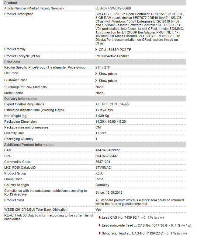 SIMATIC ET 200SP Open Controller, CPU 1515SP PC2 TF, 8 GB RAM (basic device 6ES7677-2DB40-0AA0), 128 GB CFast with Windows 10 IoT Enterprise LTSC 2019 64-bit and S7-1500 Failsafe Software Controller CPU 1505SP TF V2x preinstalled; interfaces: 1x slot CFast, 1x slot SD/MMC, 1x connection for ET 200SP BusAdapter PROFINET, 1x 10/100/1000 Mbps Ethernet, 2x USB 3.0, 2x USB 2.0, 1x DisplayPort; documentation on CFast, restore image on CFast
