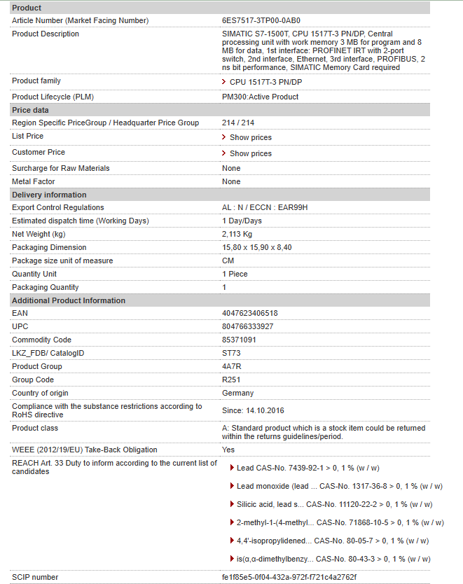 SIMATIC S7-1500T, CPU 1517T-3 PN/DP, Central processing unit with work memory 3 MB for program and 8 MB for data, 1st interface: PROFINET IRT with 2-port switch, 2nd interface, Ethernet, 3rd interf……