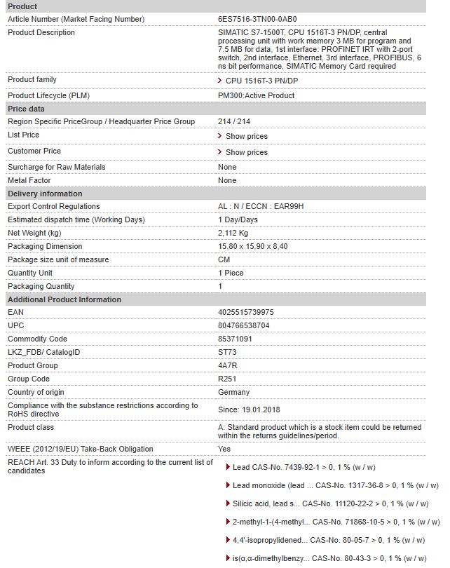 SIMATIC S7-1500T, CPU 1516T-3 PN/DP, central processing unit with work memory 3 MB for program and 7.5 MB for data, 1st interface: PROFINET IRT with 2-port switch, 2nd interface, Ethernet, 3rd inte……