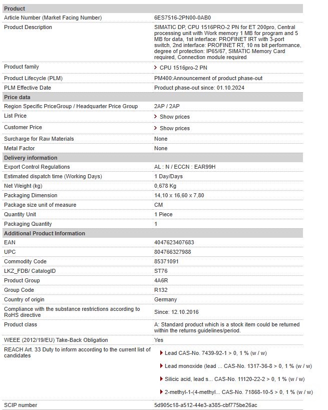 | SIMATIC DP, CPU 1516PRO-2 PN for ET 200pro, Central processing unit with Work memory 1 MB for program and 5 MB for data, 1st interface: PROFINET IRT with 3-port switch, 2nd interface: PROFINET RT, 10 ns bit performance, degree of protection: IP65/67, SIMATIC Memory Card required, Connection module required |