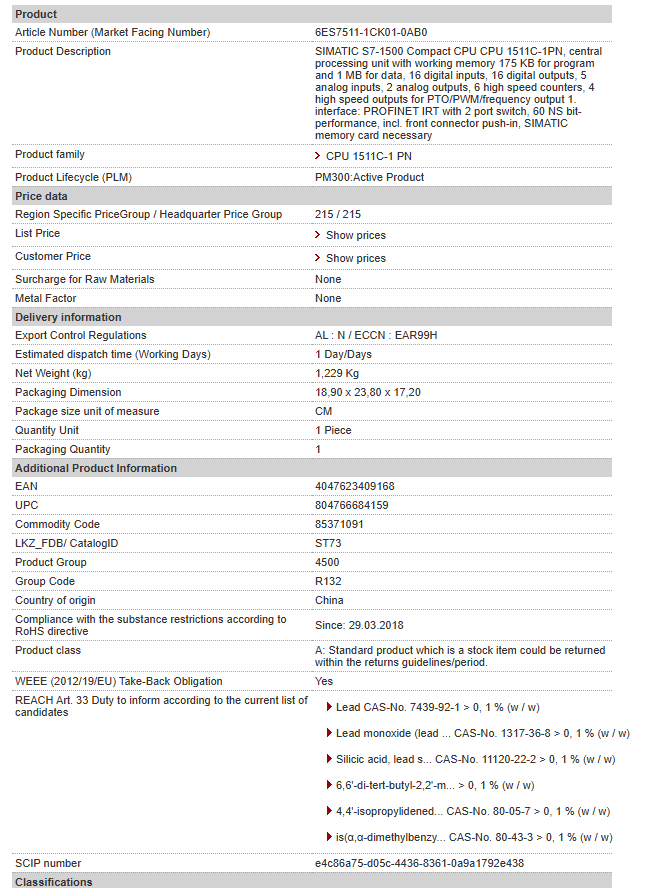 | SIMATIC S7-1500 Compact CPU CPU 1511C-1PN, central processing unit with working memory 175 KB for program and 1 MB for data, 16 digital inputs, 16 digital outputs, 5 analog inputs, 2 analog outputs, 6 high speed counters, 4 high speed outputs for PTO/PWM/frequency output 1. interface: PROFINET IRT with 2 port switch, 60 NS bit-performance, incl. front connector push-in, SIMATIC memory card necessary |