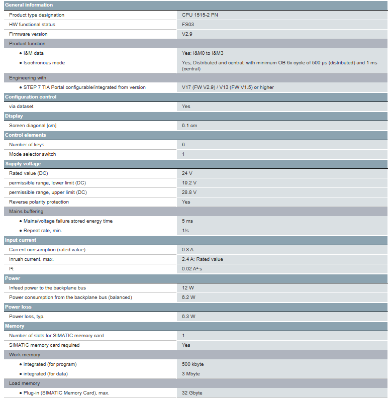 *** Spare part *** SIMATIC S7-1500, CPU 1515-2 PN, central processing unit with work memory 500 KB for program and 3 MB for data, 1st interface: PROFINET IRT with 2-port switch, 2nd interface: PROFINET RT, 30 ns bit performance, SIMATIC Memory Card required