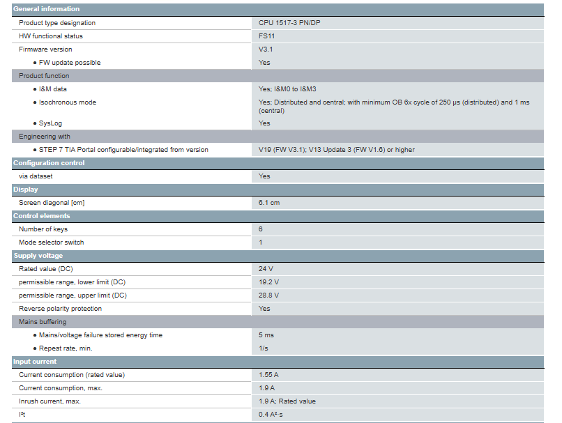 | SIMATIC S7-1500, CPU 1517-3 PN/DP, central processing unit with work memory 2 MB for program and 8 MB for data, 1st interface: PROFINET IRT with 2-port switch, 2nd interface: PROFINET RT, 3rd interface: PROFIBUS, 2 ns bit performance, SIMATIC Memory Card required |