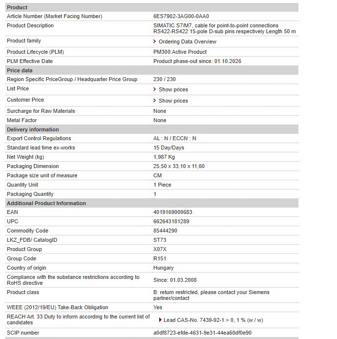 | SIMATIC S7/M7, cable for point-to-point connections RS422-RS422 15-pole D-sub pins respectively Length 50 m |
