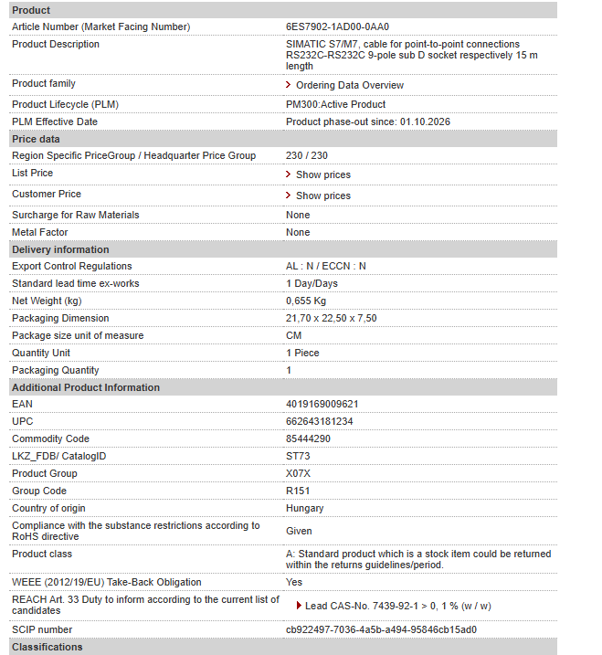 | SIMATIC S7/M7, cable for point-to-point connections RS232C-RS232C 9-pole sub D socket respectively 15 m length |