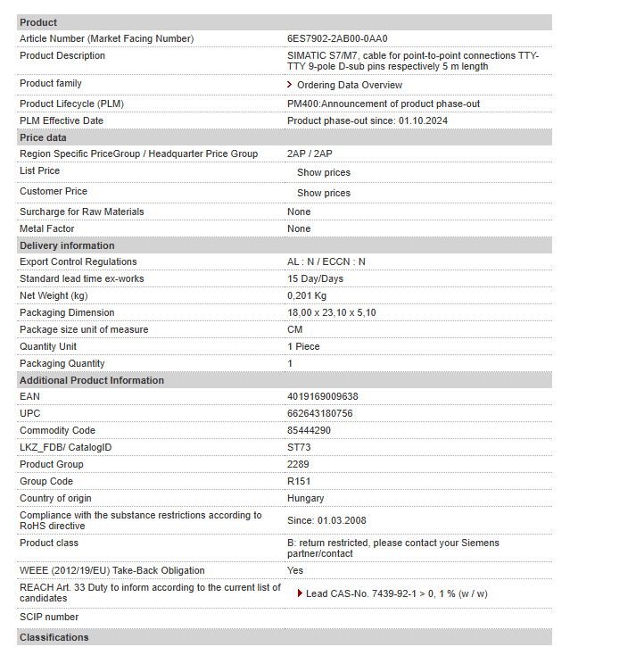 | SIMATIC S7/M7, cable for point-to-point connections TTY-TTY 9-pole D-sub pins respectively 5 m length |