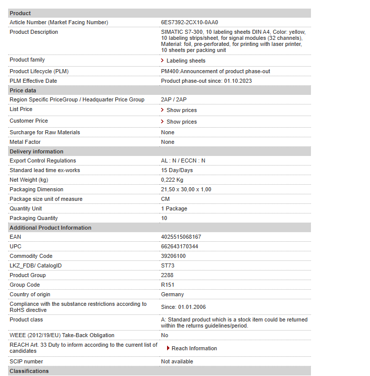 | SIMATIC S7-300, 10 labeling sheets DIN A4, Color: yellow, 10 labeling strips/sheet, for signal modules (32 channels), Material: foil, pre-perforated, for printing with laser printer, 10 sheets per packing unit |