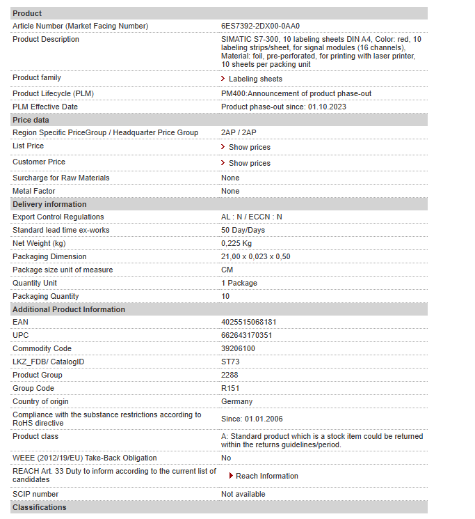 | SIMATIC S7-300, 10 labeling sheets DIN A4, Color: red, 10 labeling strips/sheet, for signal modules (16 channels), Material: foil, pre-perforated, for printing with laser printer, 10 sheets per packing unit |