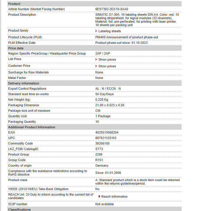 | SIMATIC S7-300, 10 labeling sheets DIN A4, Color: red, 10 labeling strips/sheet, for signal modules (32 channels), Material: foil, pre-perforated, for printing with laser printer, 10 sheets per packing unit |