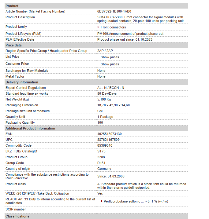 | SIMATIC S7-300, Front connector for signal modules with spring-loaded contacts, 20-pole 100 units per packing unit |