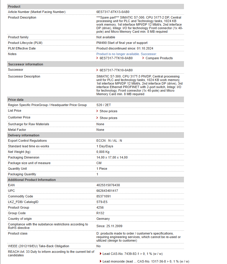 ***Spare part*** SIMATIC S7-300, CPU 317T-2 DP, Central processing unit for PLC and Technology tasks, 1024 KB work memory, 1st interface MPI/DP 12 Mbit/s, 2nd interface DP (drive), Integr. I/O for technology Front connector (1x 40-pole) and Micro Memory Card min. 8 MB required