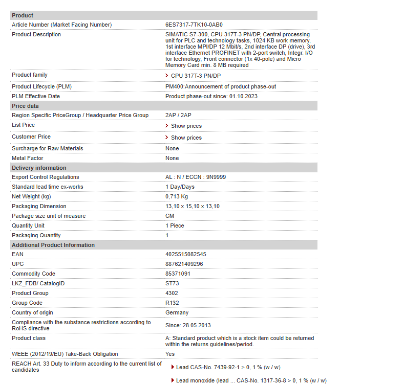 | SIMATIC S7-300, CPU 317T-3 PN/DP, Central processing unit for PLC and technology tasks, 1024 KB work memory, 1st interface MPI/DP 12 Mbit/s, 2nd interface DP (drive), 3rd interface Ethernet PROFINET with 2-port switch, Integr. I/O for technology, Front connector (1x 40-pole) and Micro Memory Card min. 8 MB required |