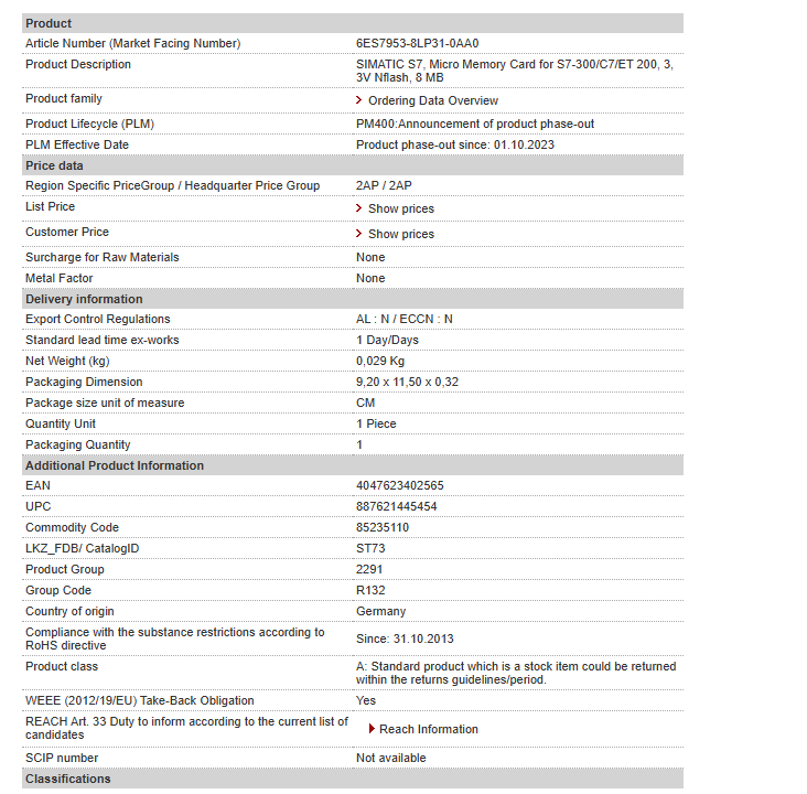 please contact us SIMATIC S7, Micro Memory Card for S7-300/C7/ET 200, 3, 3V Nflash, 8 MB