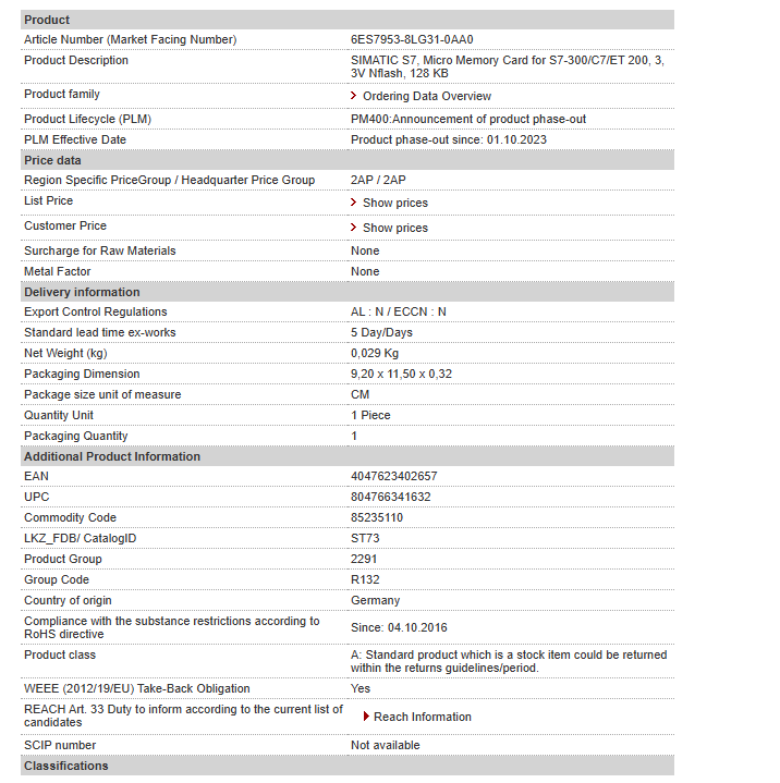 | SIMATIC S7, Micro Memory Card for S7-300/C7/ET 200, 3, 3V Nflash, 128 KB |
