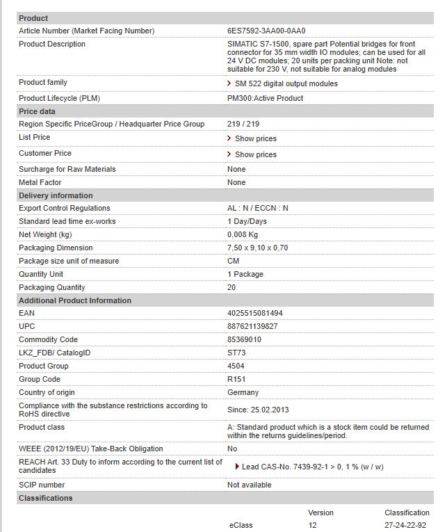 | SIMATIC S7-1500, spare part Potential bridges for front connector for 35 mm width IO modules; can be used for all 24 V DC modules; 20 units per packing unit Note: not suitable for 230 V, not suitable for analog modules |