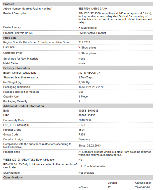 SIMATIC S7-1500, mounting rail 160 mm (approx. 6.3 inch); incl. grounding screw, integrated DIN rail for mounting of incidentals such as terminals, automatic circuit breakers and relays