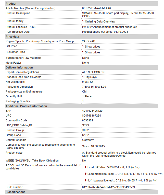 | SIMATIC S7-1500, spare part display, 35 mm for S7-1500 CPUs |