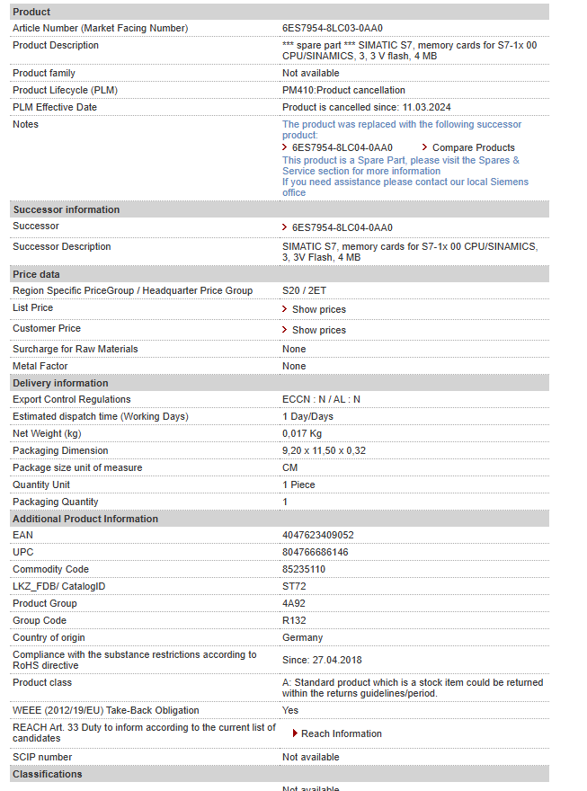 *** spare part *** SIMATIC S7, memory cards for S7-1x 00 CPU/SINAMICS, 3, 3 V flash, 4 MB