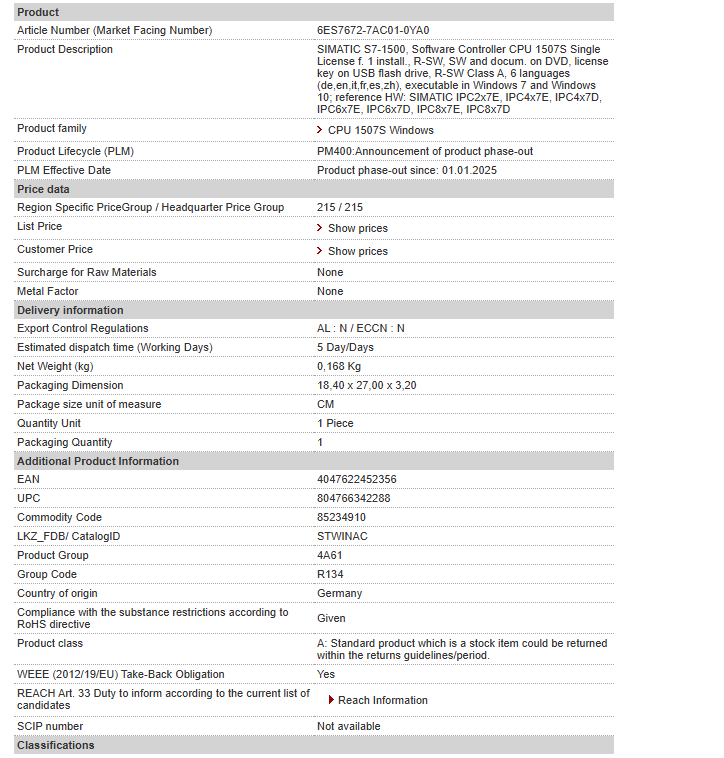 SIMATIC S7-1500, Software Controller CPU 1507S Single License f. 1 install., R-SW, SW and docum. on DVD, license key on USB flash drive, R-SW Class A, 6 languages (de,en,it,fr,es,zh), executable in Windows 7 and Windows 10; reference HW: SIMATIC IPC2x7E, IPC4x7E, IPC4x7D, IPC6x7E, IPC6x7D, IPC8x7E, IPC8x7D