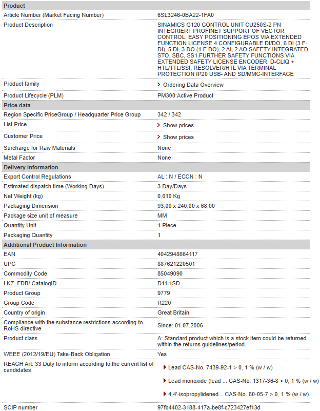 | SINAMICS G120 CONTROL UNIT CU250S-2 PN INTEGRIERT PROFINET SUPPORT OF VECTOR CONTROL, EASY POSITIONING EPOS VIA EXTENDED FUNCTION LICENSE 4 CONFIGURABLE DI/DO, 6 DI (3 F-DI), 5 DI, 3 DO (1 F-DO), 2 AI, 2 AO SAFETY INTEGRATED STO, SBC, SS1 FURTHER SAFETY FUNCTIONS VIA EXTENDED SAFETY LICENSE ENCODER: D-CLIQ + HTL/TTL/SSI, RESOLVER/HTL VIA TERMINAL PROTECTION IP20 USB- AND SD/MMC-INTERFACE |