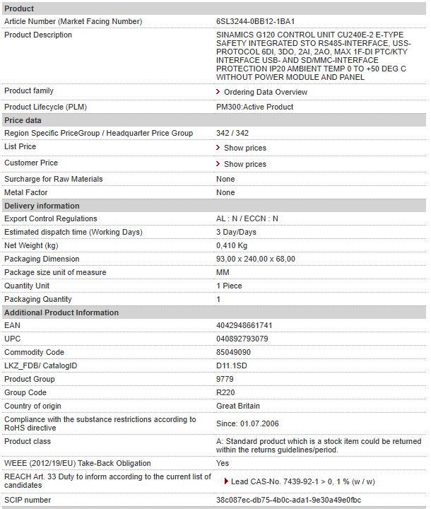 SINAMICS G120 CONTROL UNIT CU240E-2 E-TYPE SAFETY INTEGRATED STO RS485-INTERFACE, USS-PROTOCOL 6DI, 3DO, 2AI, 2AO, MAX 1F-DI PTC/KTY INTERFACE USB- AND SD/MMC-INTERFACE PROTECTION IP20 AMBIENT TEMP……