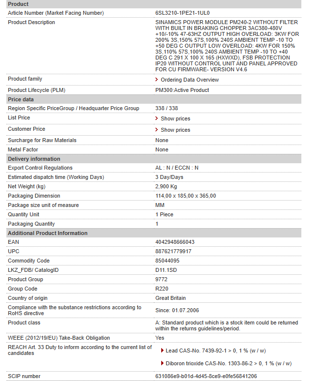 SINAMICS POWER MODULE PM240-2 WITHOUT FILTER WITH BUILT IN BRAKING CHOPPER 3AC380-480V +10/-10% 47-63HZ OUTPUT HIGH OVERLOAD: 3KW FOR 200% 3S,150% 57S,100% 240S AMBIENT TEMP -10 TO +50 DEG C OUTPUT LOW OVERLOAD: 4KW FOR 150% 3S,110% 57S,100% 240S AMBIENT TEMP -10 TO +40 DEG C 291 X 100 X 165 (HXWXD), FSB PROTECTION IP20 WITHOUT CONTROL UNIT AND PANEL APPROVED FOR CU FIRMWARE- VERSION V4.6