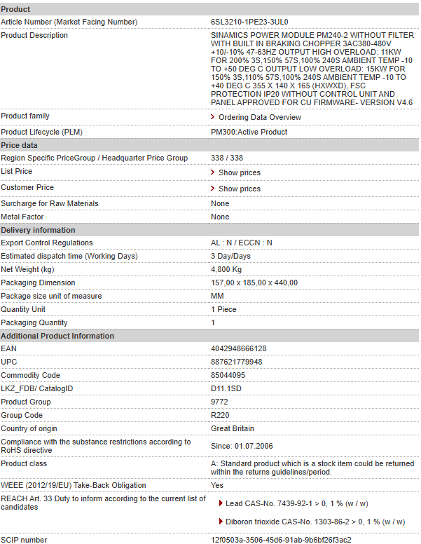 SINAMICS POWER MODULE PM240-2 WITHOUT FILTER WITH BUILT IN BRAKING CHOPPER 3AC380-480V +10/-10% 47-63HZ OUTPUT HIGH OVERLOAD: 11KW FOR 200% 3S,150% 57S,100% 240S AMBIENT TEMP -10 TO +50 DEG C OUTPUT LOW OVERLOAD: 15KW FOR 150% 3S,110% 57S,100% 240S AMBIENT TEMP -10 TO +40 DEG C 355 X 140 X 165 (HXWXD), FSC PROTECTION IP20 WITHOUT CONTROL UNIT AND PANEL APPROVED FOR CU FIRMWARE- VERSION V4.6