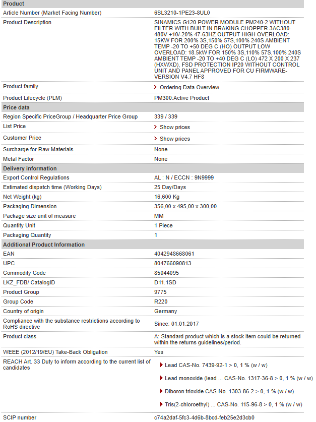 SINAMICS G120 POWER MODULE PM240-2 WITHOUT FILTER WITH BUILT IN BRAKING CHOPPER 3AC380-480V +10/-20% 47-63HZ OUTPUT HIGH OVERLOAD: 15KW FOR 200% 3S,150% 57S,100% 240S AMBIENT TEMP -20 TO +50 DEG C ……