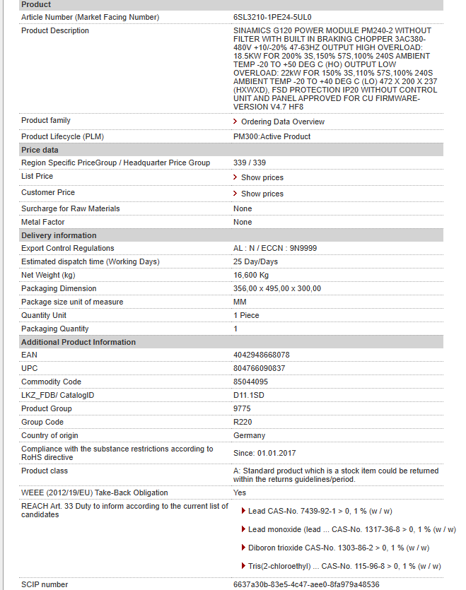 SINAMICS G120 POWER MODULE PM240-2 WITHOUT FILTER WITH BUILT IN BRAKING CHOPPER 3AC380-480V +10/-20% 47-63HZ OUTPUT HIGH OVERLOAD: 18.5KW FOR 200% 3S,150% 57S,100% 240S AMBIENT TEMP -20 TO +50 DEG ……