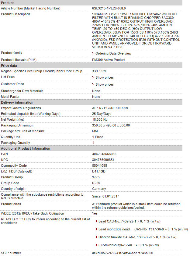 SINAMICS G120 POWER MODULE PM240-2 WITHOUT FILTER WITH BUILT IN BRAKING CHOPPER 3AC380-480V +10/-20% 47-63HZ OUTPUT HIGH OVERLOAD: 22KW FOR 200% 3S,150% 57S,100% 240S AMBIENT TEMP -20 TO +50 DEG C (HO) OUTPUT LOW OVERLOAD: 30kW FOR 150% 3S,110% 57S,100% 240S AMBIENT TEMP -20 TO +40 DEG C (LO) 472 X 200 X 237 (HXWXD), FSD PROTECTION IP20 WITHOUT CONTROL UNIT AND PANEL APPROVED FOR CU FIRMWARE- VERSION V4.7 HF8