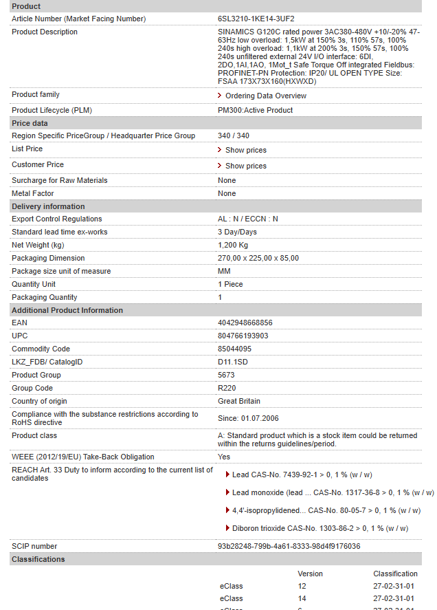 | SINAMICS G120C rated power 3AC380-480V +10/-20% 47-63Hz low overload: 1,5kW at 150% 3s, 110% 57s, 100% 240s high overload: 1,1kW at 200% 3s, 150% 57s, 100% 240s unfiltered external 24V I/O interface: 6DI, 2DO,1AI,1AO, 1Mot_t Safe Torque Off integrated Fieldbus: PROFINET-PN Protection: IP20/ UL OPEN TYPE Size: FSAA 173X73X160(HXWXD) |