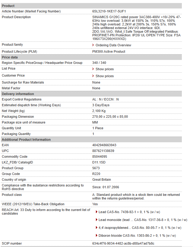 | SINAMICS G120C rated power 3AC380-480V +10/-20% 47-63Hz low overload: 3,0kW at 150% 3s, 110% 57s, 100% 240s high overload: 2,2kW at 200% 3s, 150% 57s, 100% 240s unfiltered external 24V I/O interface: 6DI, 2DO,1AI,1AO, 1Mot_t Safe Torque Off integrated Fieldbus: PROFINET-PN Protection: IP20/ UL OPEN TYPE Size: FSA 196X73X200(HXWXD) |