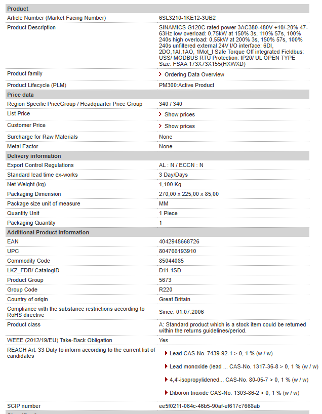 SINAMICS G120C rated power 3AC380-480V +10/-20% 47-63Hz low overload: 0,75kW at 150% 3s, 110% 57s, 100% 240s high overload: 0,55kW at 200% 3s, 150% 57s, 100% 240s unfiltered external 24V I/O interface: 6DI, 2DO,1AI,1AO, 1Mot_t Safe Torque Off integrated Fieldbus: USS/ MODBUS RTU Protection: IP20/ UL OPEN TYPE Size: FSAA 173X73X155(HXWXD)
