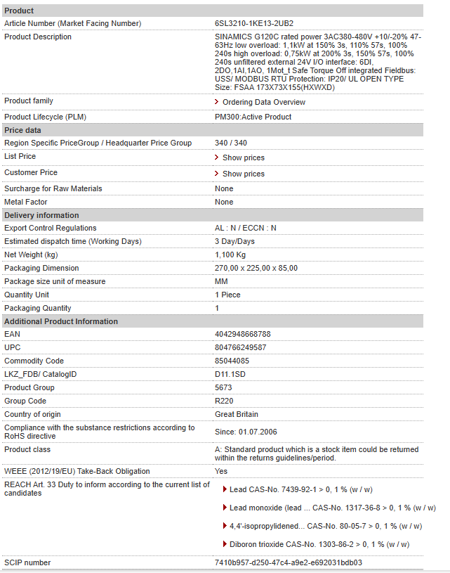 | SINAMICS G120C rated power 3AC380-480V +10/-20% 47-63Hz low overload: 1,1kW at 150% 3s, 110% 57s, 100% 240s high overload: 0,75kW at 200% 3s, 150% 57s, 100% 240s unfiltered external 24V I/O interface: 6DI, 2DO,1AI,1AO, 1Mot_t Safe Torque Off integrated Fieldbus: USS/ MODBUS RTU Protection: IP20/ UL OPEN TYPE Size: FSAA 173X73X155(HXWXD) |